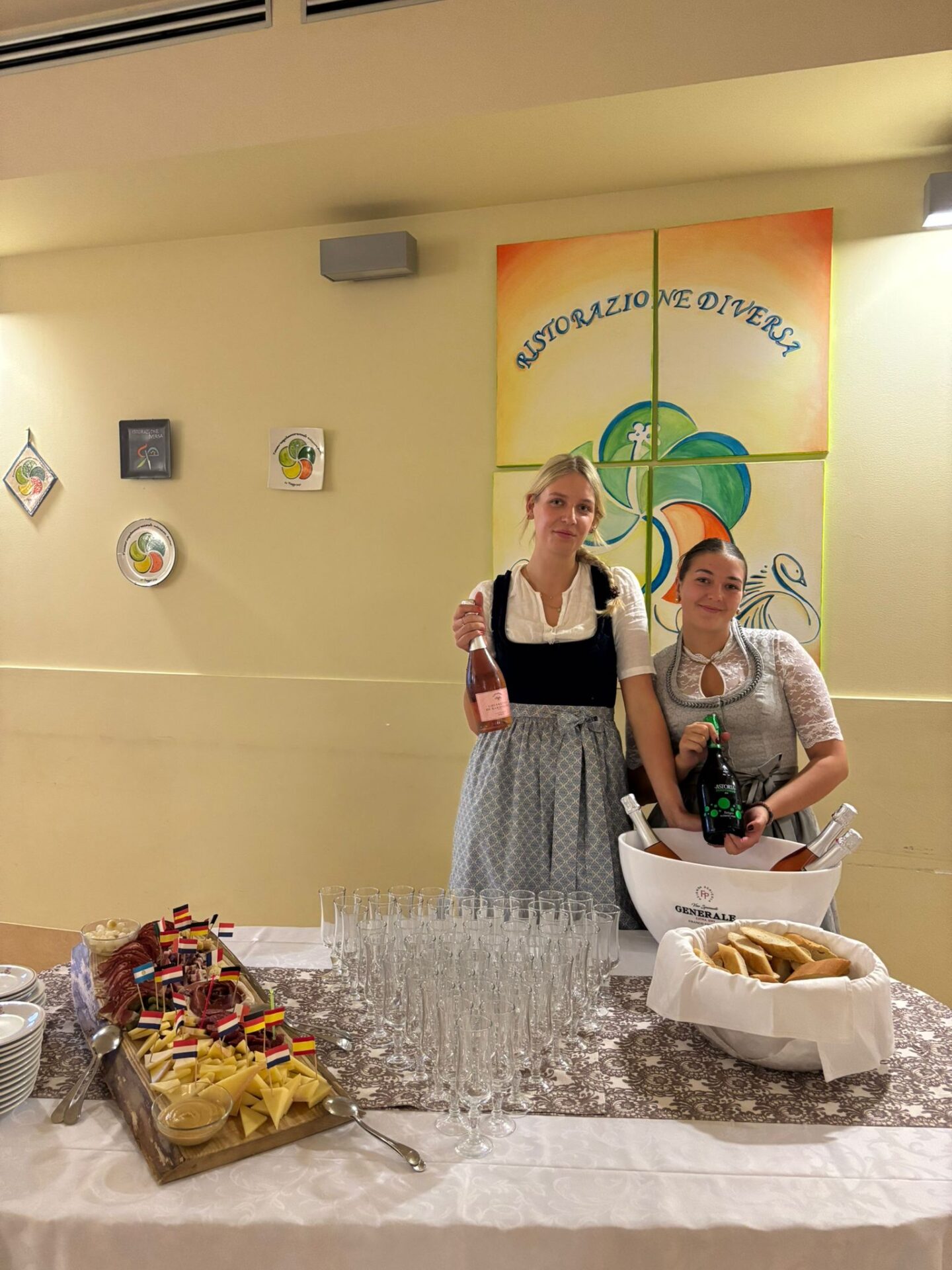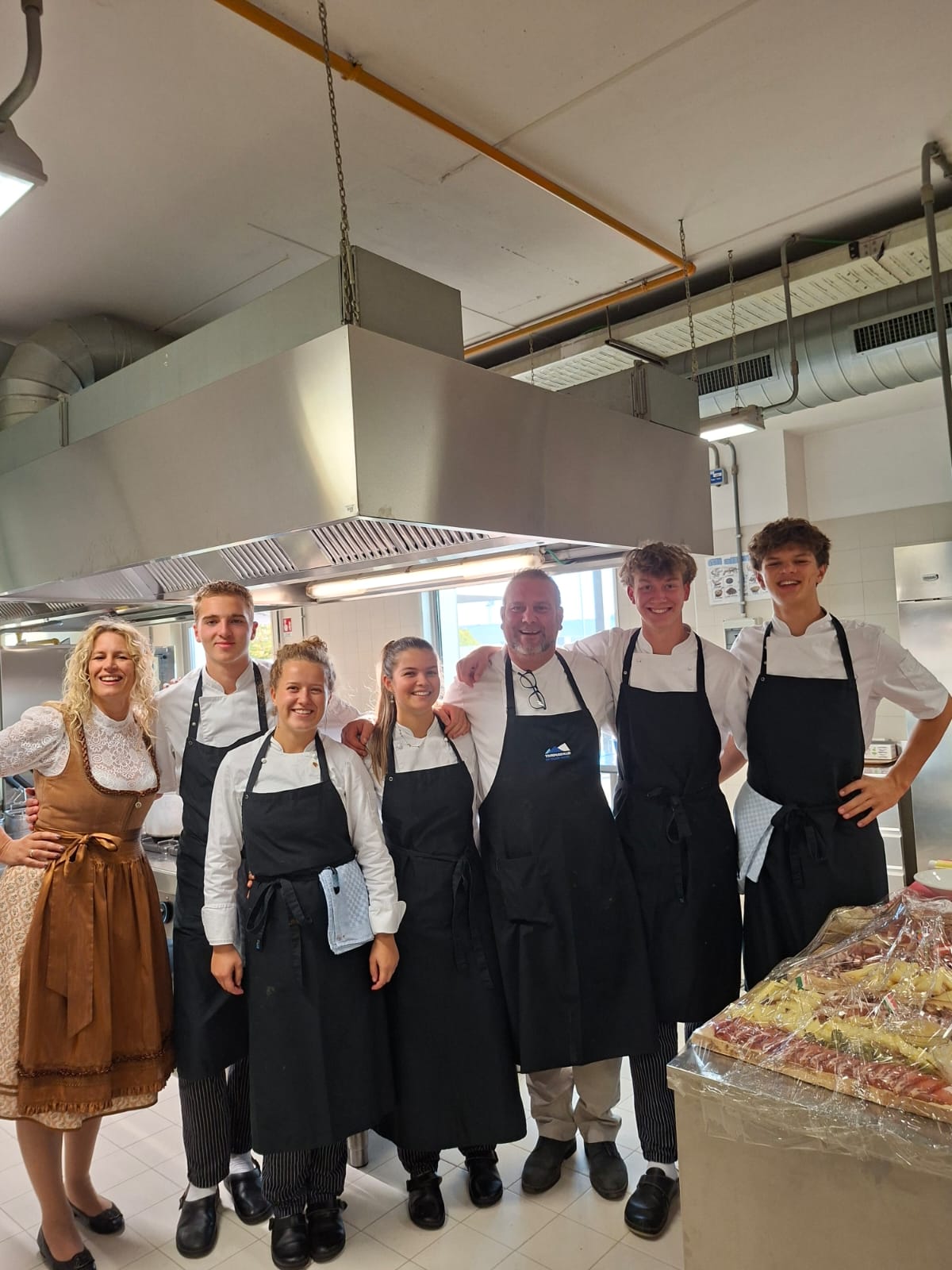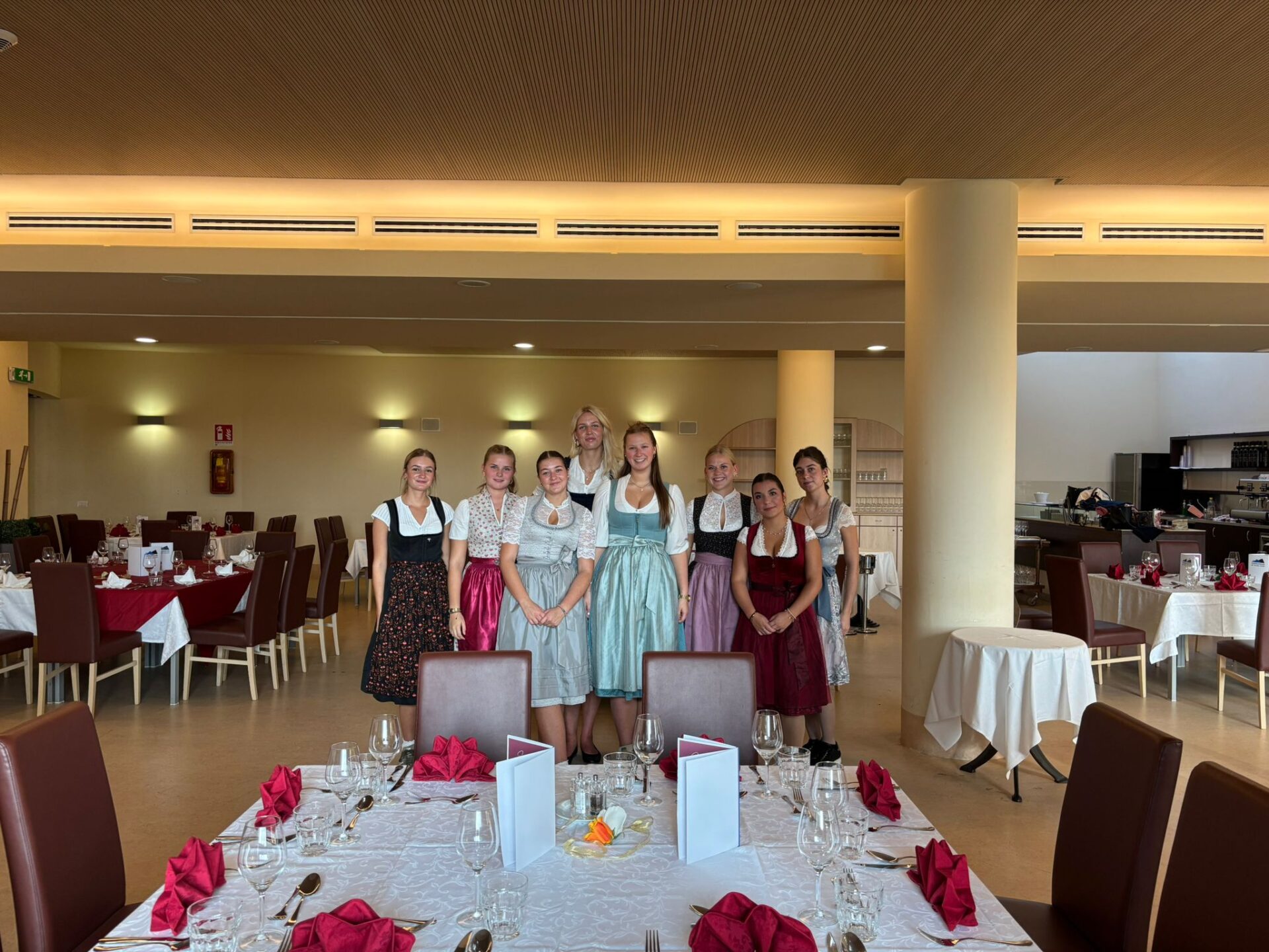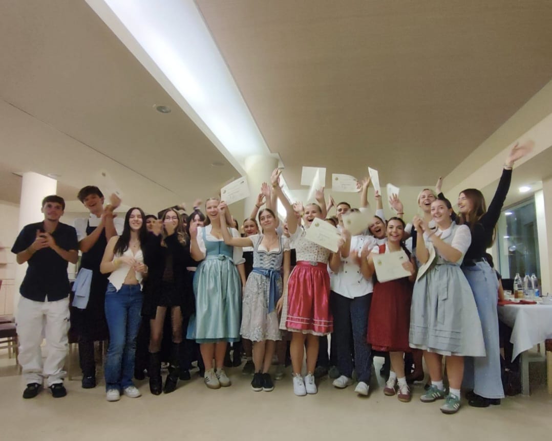 Wie es bereits Tradition bei diesem Austausch ist, fand am letzten Abend vor der Rückreise ein österreichischer Abend statt, bei dem unsere Schüler:innen als Dankeschön ihre Gastfamilien, Ehrengäste sowie Unterstützer des Austausches mit einem typischen Tiroler Menü bewirteten. In traditioneller Tracht – Dirndl und Lederhosen – servierten unsere zukünftigen Touristiker:innen kulinarische Spezialitäten aus Tirol.