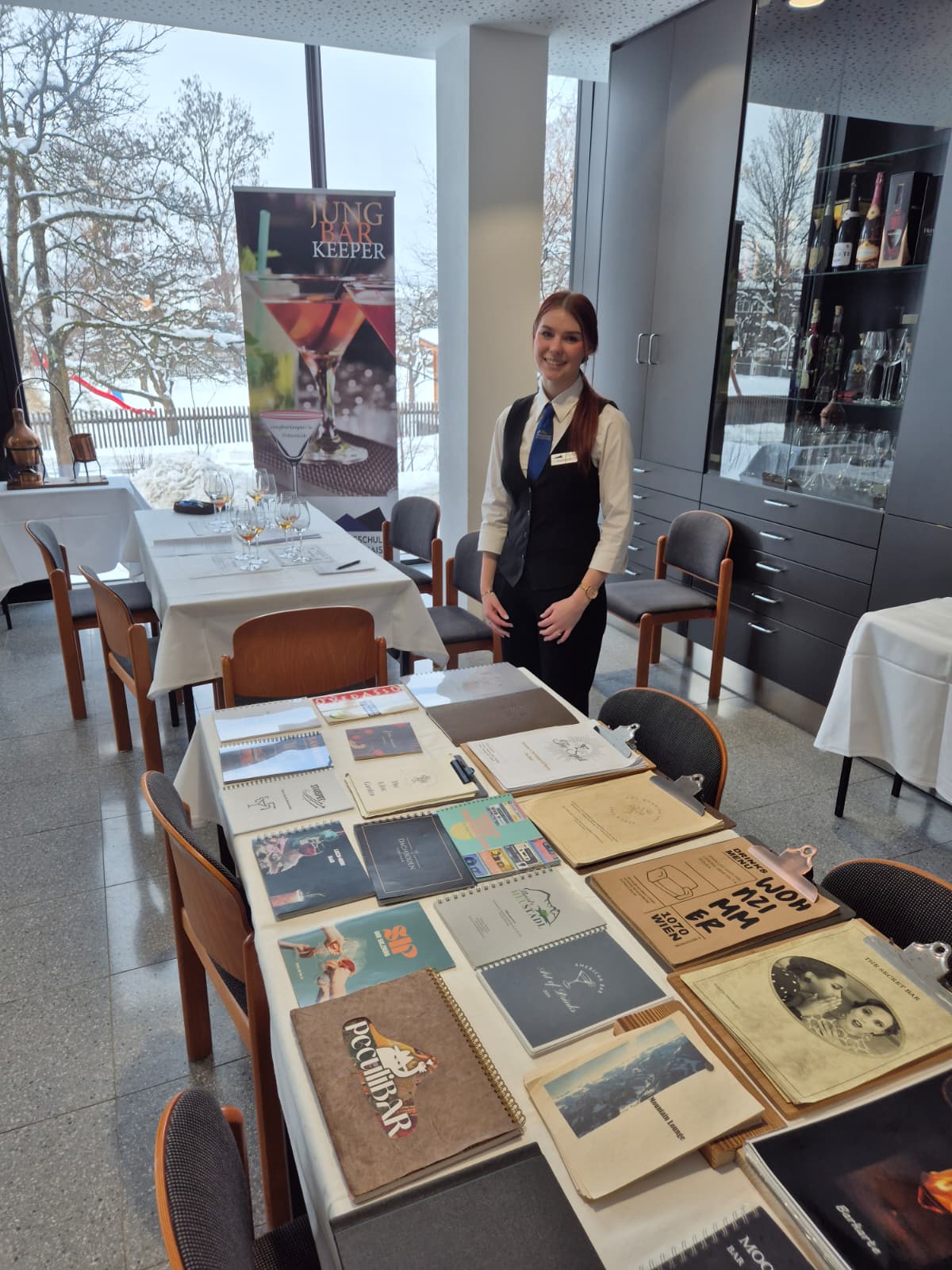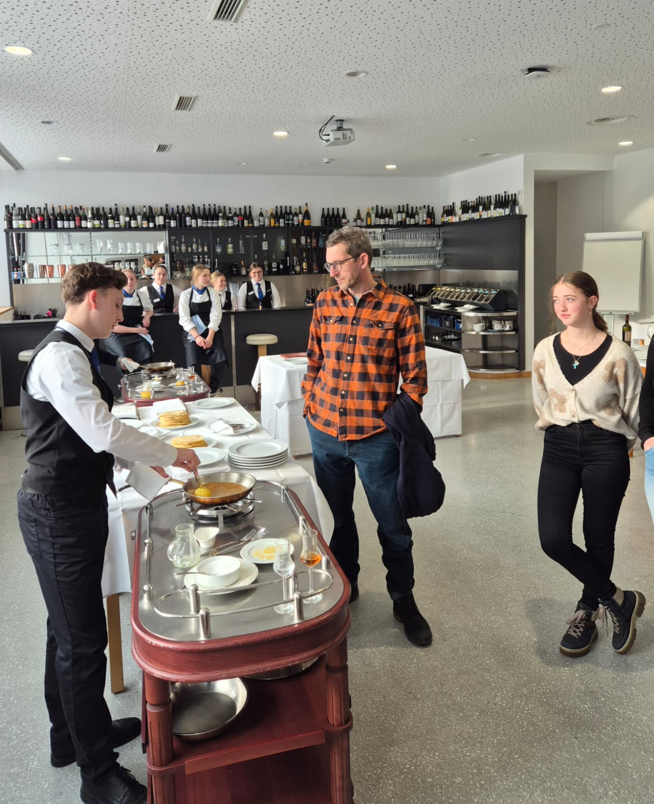 Ein Fixpunkt war die stündliche, humorvolle und mitreißende Modenschau, bei der unsere einheitliche Praxiskleidung für Service, Bar und Küche von unseren Schüler:innen gekonnt in Szene gesetzt wurde.