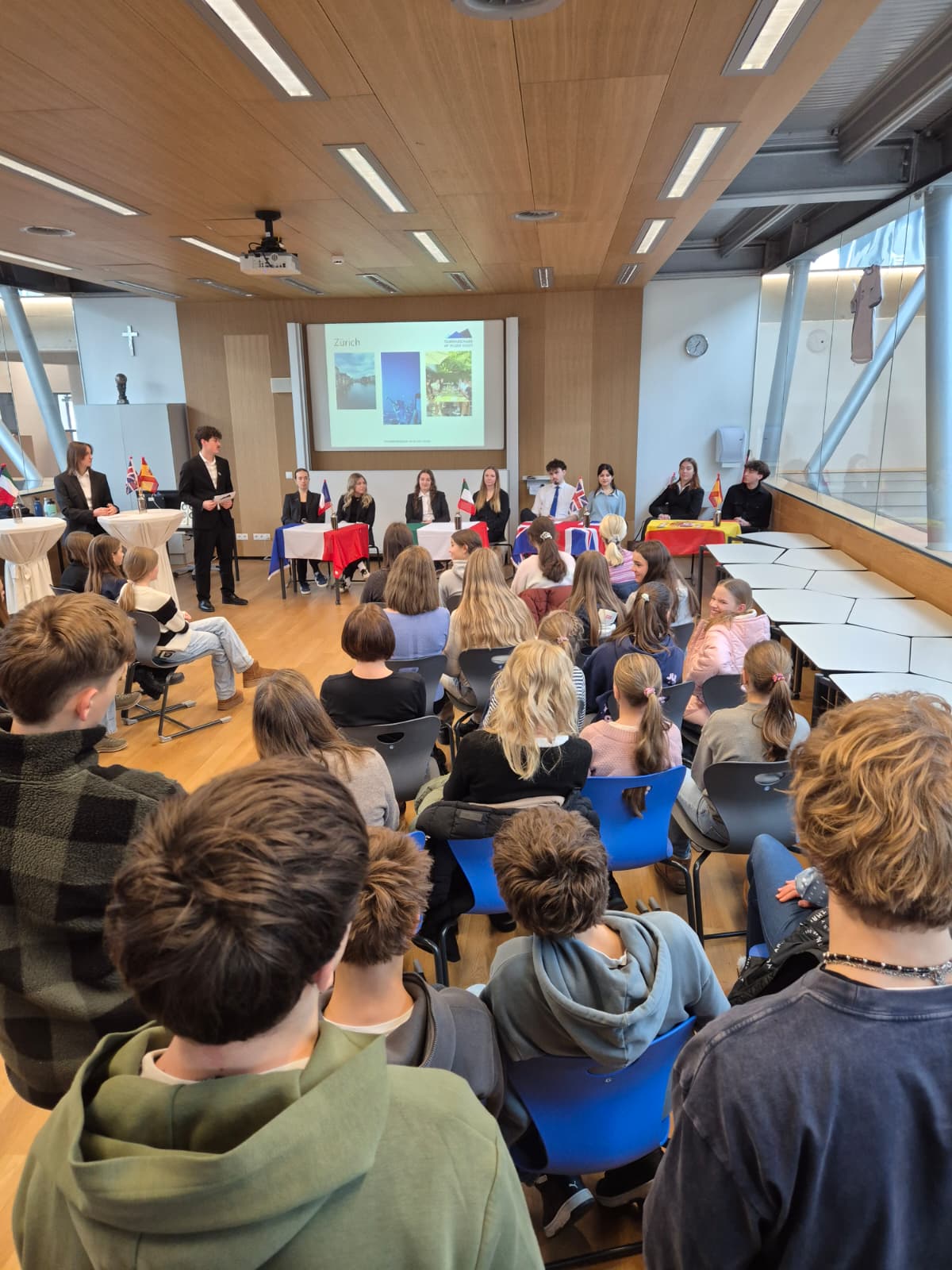 Bei individuellen Schulführungen, die den Gästen einen guten Einblick über die umfangreichen Ausbildungsmöglichkeiten in Tourismus und Wirtschaft sowie 4 lebenden Fremdsprachen gaben, konnte man sich ebenso über unsere Sommer-Praktika im In- und Ausland, Exkursionen und Klassenreisen informieren, mit unseren Buddies über den Schulalltag plaudern, sich über unsere heurigen 3 Junior-Companies informieren, das „Schulkino“ besuchen und noch vieles mehr. Großer Andrang herrschte bei den „Fremdsprachen-Interviews“, bei denen unsere Schüler:innen in der bevorzugten Fremdsprache über ihre Praktikumseinsätze im Ausland referierten und so eindrucksvoll ihre Sprachkenntnisse unter Beweis stellten.